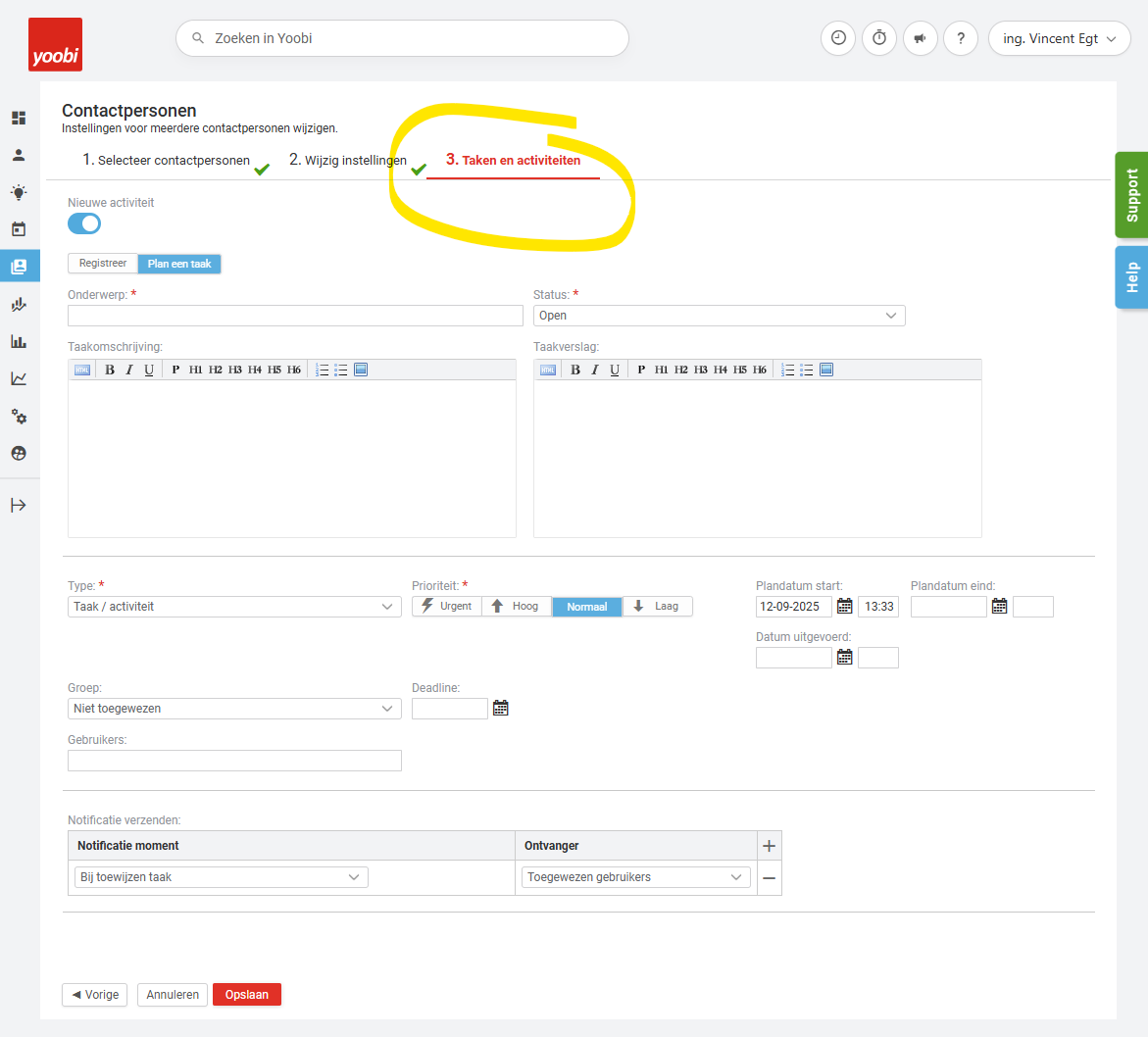 Vanaf 12 September 2025 ondersteunt de bulkmutatie Contactpersonen bij de CRM module oók taken aanmaken.