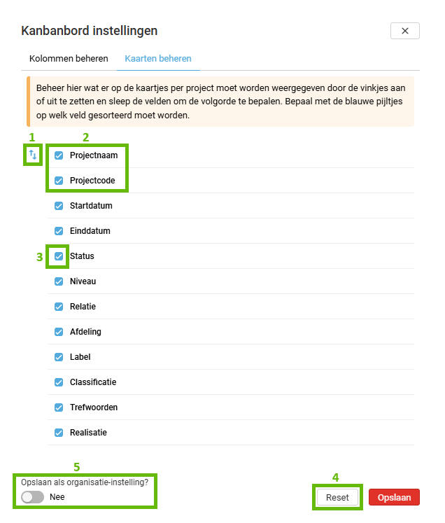 Kaarten beheren: Bepaal welke gegevens/velden van het project in het kaartje getoond moeten worden en in welke volgorde. Ook stel je hier in op welk veld de kaartjes gesorteerd moeten worden in het bord (zie 9).