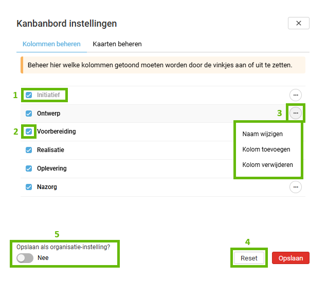 Kanbanbord instellingen: Kolommen beheren